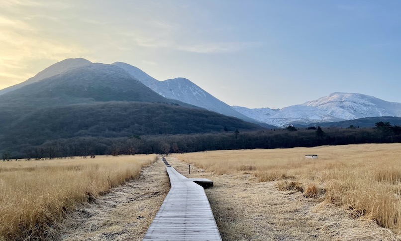 宿から車道を10分歩いて、長者原のくじゅう登山口に到着。まず雨ヶ池を目指します。タデ原の木道が良い雰囲気。この日の後半は、雲がかかって景色は楽しめませんでしたが、早朝はいい天気でした。