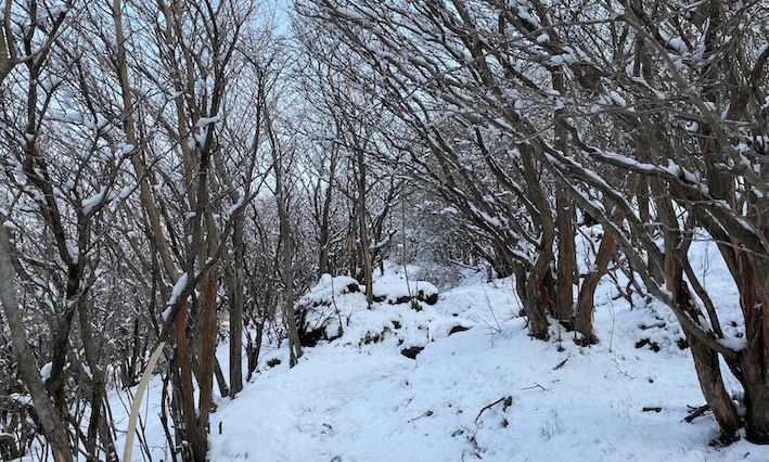 木道を過ぎると広葉樹の林に入ります。雪量も増え、チェーンスパイクを着用しました。