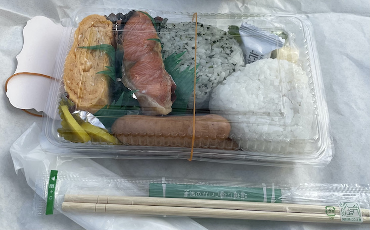 8時00分、旅館にご用意頂いた弁当で朝食。おにぎり二個・分厚い焼鮭・甘い玉子焼き・ウインナー・沢庵・キャンディと一口チーズ。最高の弁当でした。