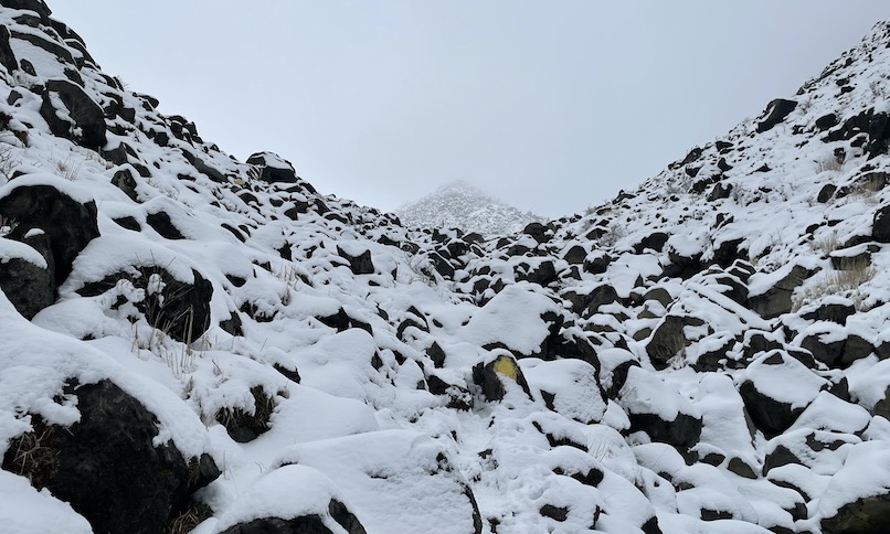 10時15分、北千里浜に到着。ここは諏我守から久住わかれに至る、周囲を山に囲まれた平地です。登山者も少なく、雪とガスが垂れ込め、自然の恐さを感じさせる空間でした。後で調べたところ、過去に大きな遭難事故があった場所のようです。