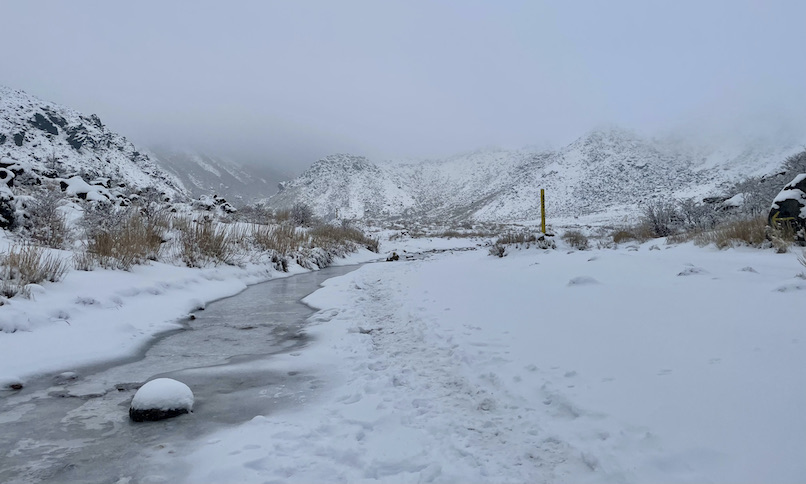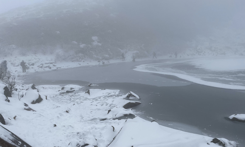 法華院温泉から北千里浜までは、ほとんど誰にも会いませんでしたが、避難小屋もある久住わかれで牧ノ戸峠からの登山者と合流しました。ここから中岳を目指します。途中、眼下に見えるのは凍った御池。